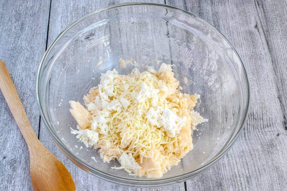 - Incorporar los quesos: Añade el queso semicurado y la mozzarella, y sigue amasando hasta obtener una masa lisa.