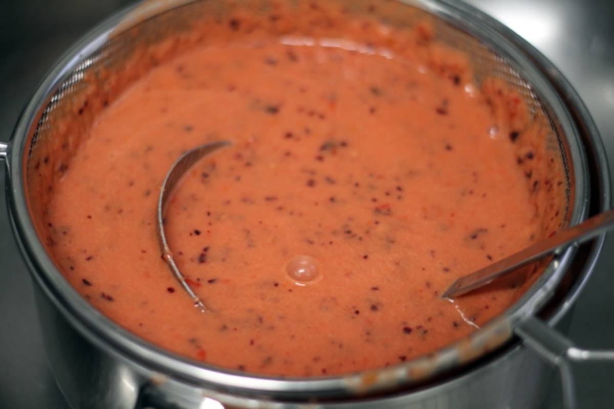- Colar y rectificar: Pasa el gazpacho por un colador fino y ajusta la consistencia y el sabor con más agua, vinagre, aceite y sal si es necesario.