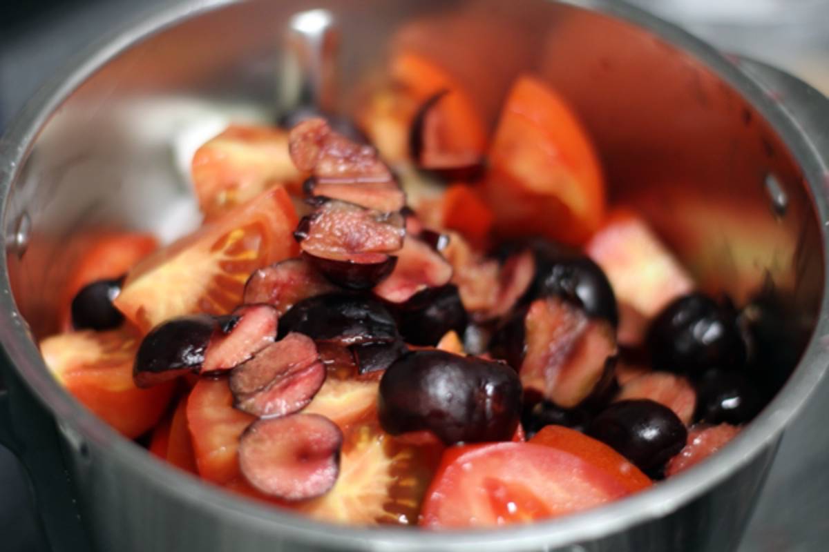 - Preparación de ingredientes: Limpia y quita los huesos de las cerezas. Corta los tomates, pimientos y cebolla en trozos.