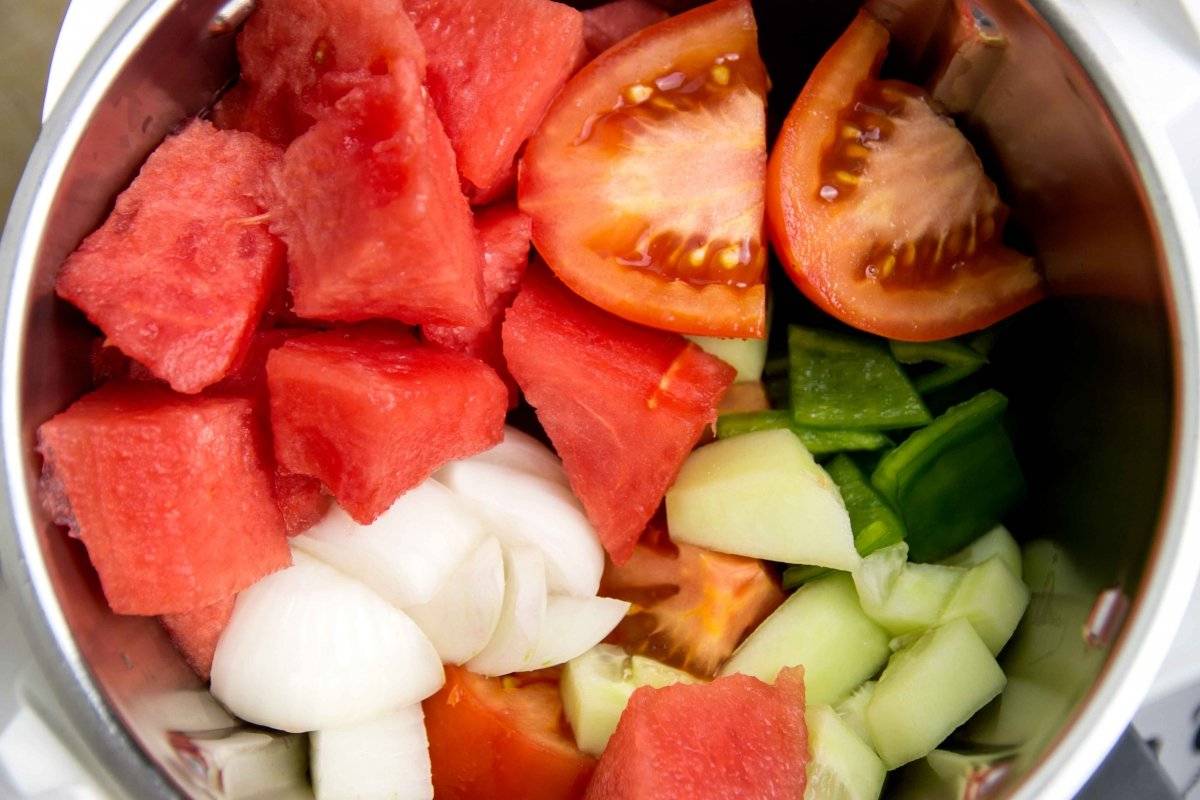 - Preparación de ingredientes: Lava y corta los tomates y el pimiento en trozos. Pela y quita el germen al ajo. Corta la sandía y el pan en trozos.
