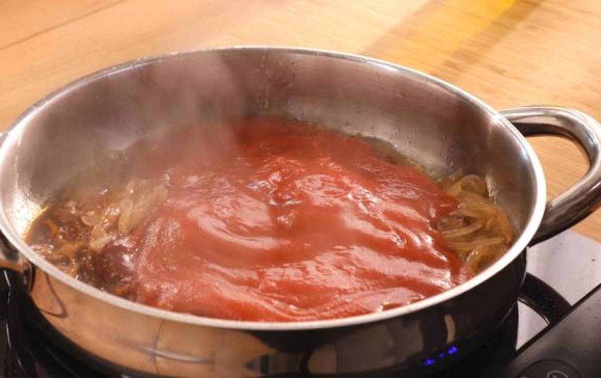- Añade tomate y caldo: Incorpora el tomate natural triturado y el caldo elegido. Si lo deseas, añade un poco de azúcar para equilibrar la acidez.